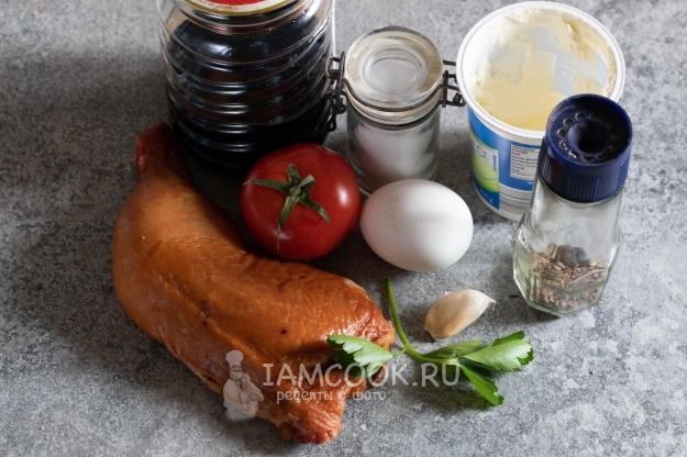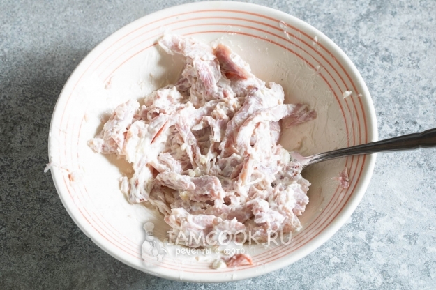 Сдабриваем копчёную курицу сметаной с продавленным через пресс чесноком, солью и перцем.