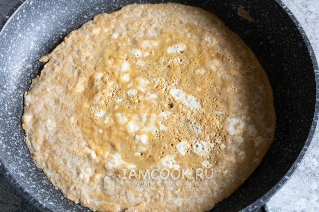 На предварительно прогретой и слегка смазанной растительным маслом сковороде выпекаем на слабом или среднем огне тонкий плотный омлет. Даём ему остыть.