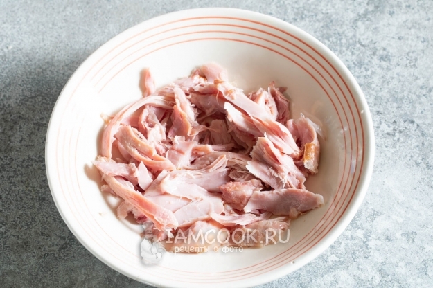 Пока омлеты остывают, измельчаем курицу на кусочки, которые удобно накалывать на вилку и отправлять в рот за один укус.