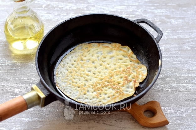 На конфорке разогрейте сковороду. Лучше всего подойдет специальная блинная сковорода, также можно использовать чугунную с толстым дном. Поверхность сковороды перед первым блином обязательно смажьте маслом, используя силиконовую кисть. Жарьте блины на высоком огне буквально по полминуты с каждой стороны. Тесто на сковороду лейте в малом количестве, чтобы изделия получились как можно тоньше.