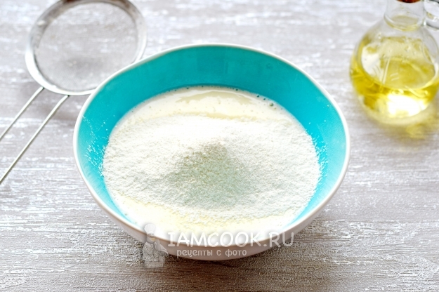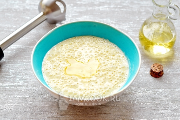 Тесто не нужно настаивать, можно сразу приступать к жарке. Влейте растительное масло, хорошо распределите его старательным перемешиванием, чтобы сверху не осталось жирного слоя масла.