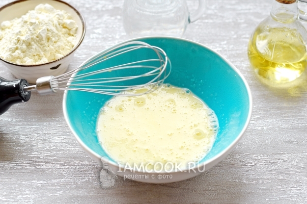 В глубокую миску разбейте 2 куриных яйца, интенсивно взбейте их венчиком, получая однородный яичный состав с пузырьками воздуха на поверхности.