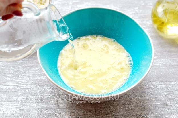 Воду заранее нагрейте до теплого состояния. Тонкой струей жидкость влейте в основной состав, распределите ее по смеси, перемешивая активно ложкой.