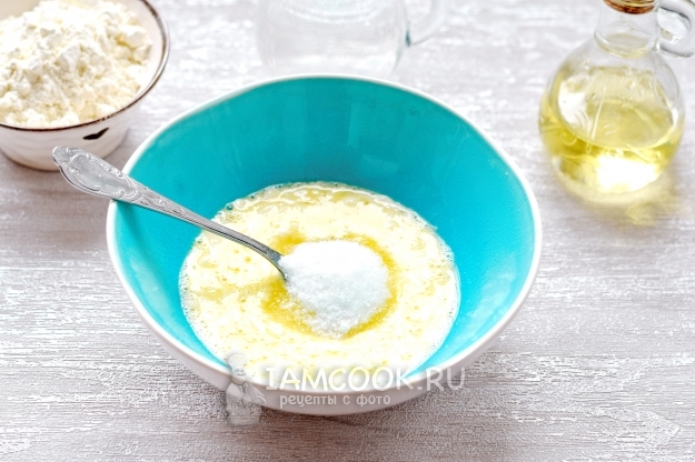 Всыпьте подсластитель в виде сахарного песка, также обязательно добавьте щепотку соли, она только усилит сладость теста.