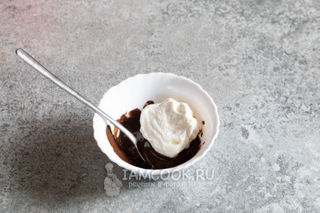 Делим взбитые сливки на 2 части. Половину в два-три захода вмешиваем в предварительно растопленный до жидкого состояния шоколад.