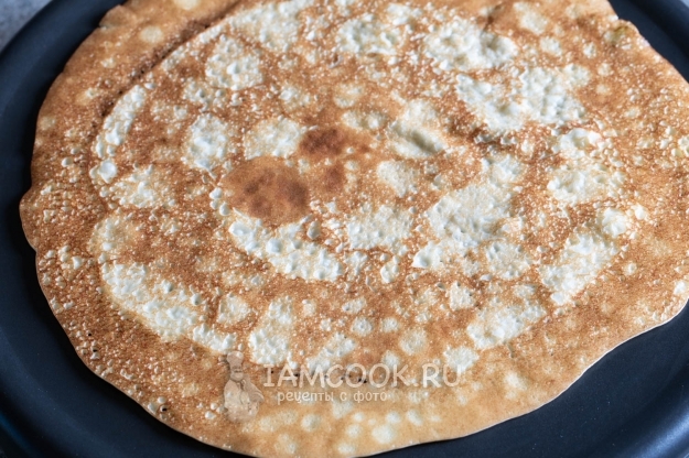 Выпекаем очень тонкие блины с большой площадью. На антипригарном покрытии они пекутся без масла. Первая сторона должна полностью пропечься и пойти пузырями, после этого можно переворачивать.
