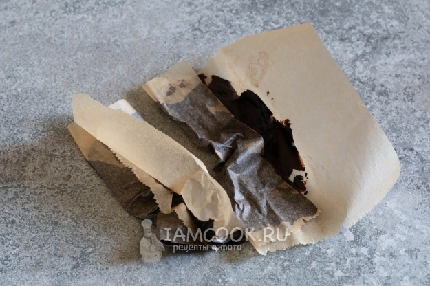 Разрезаем бумагу с ганашем в соответствии с количеством блинов. Отдираем бумажку с одной стороны ганаша, комкаем оставшуюся в сравнительно прямоугольные конструкции и помещаем в морозилку или холодильник.