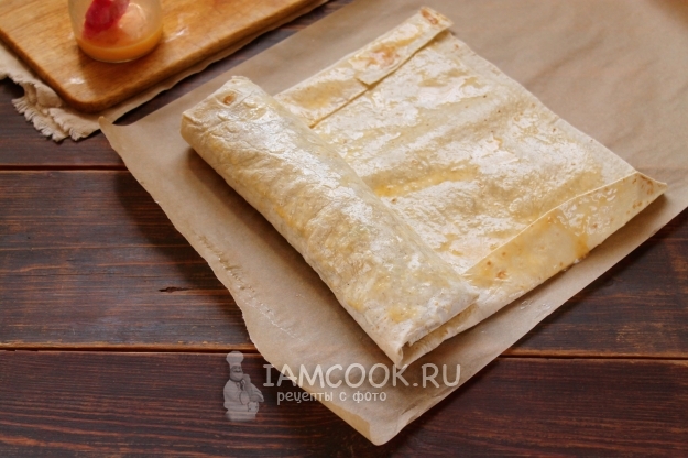 Сворачиваем рулет и смазываем яичной смесью с обратной стороны.