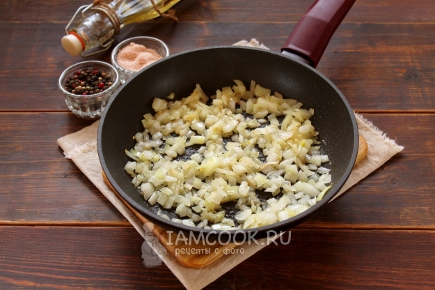 На раскаленной сковороде с добавлением растительного масла 2-3 минуты обжариваем нашинкованный репчатый лук.