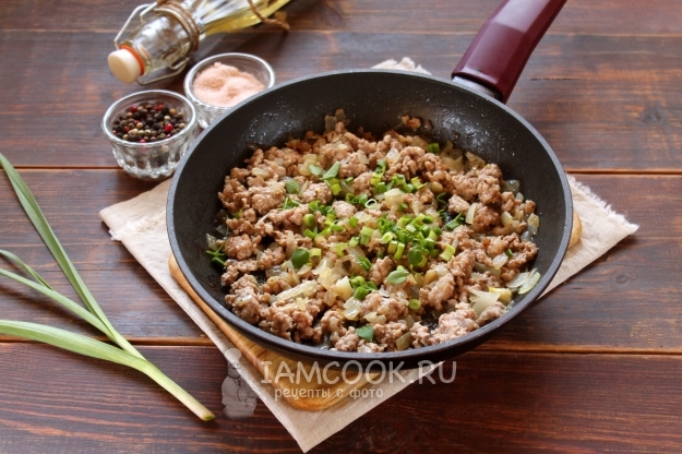 Выкладываем мясной фарш, мешаем, продолжаем готовку на верхнем огне еще минуты 3-4.