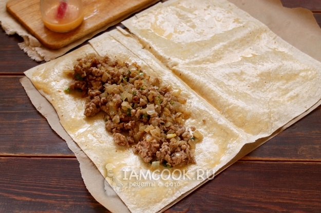 Лаваш разворачиваем, покрываем взболтанным с водой или молоком яйцом. Распределяем начинку из фарша.