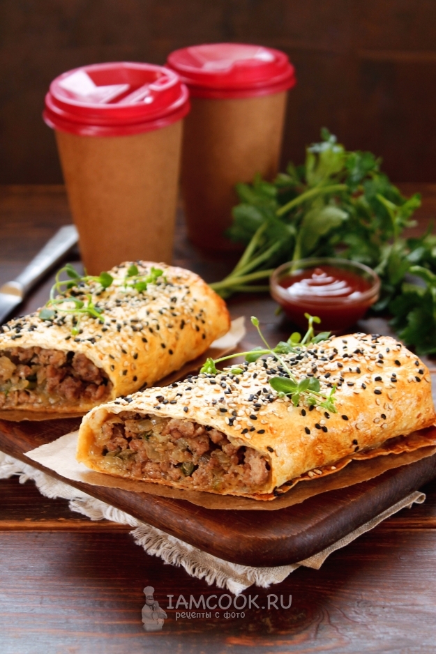 Сытный вариант простой закуски — из гибкого армянского лаваша и мясной начинки. По желанию усиливайте остроту, резкость или пряные ароматы, добавляя чеснок, травы, перец чили и т.п.