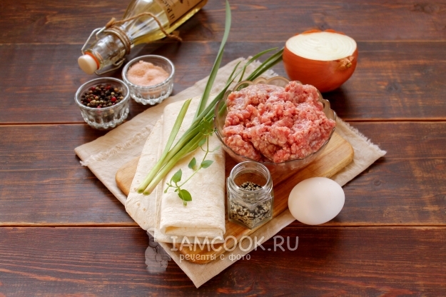 Для запекания рулета из лаваша с мясным фаршем в духовке возьмите продукты по списку. Сорт мяса, набор специй и зелень — на ваше усмотрение. Чтобы склеивать, лепешку покрывают яйцом, яйцом с молоком или водой, постным или растопленным сливочным маслом.