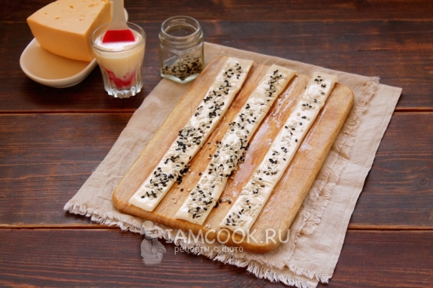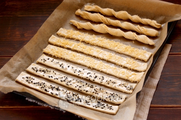 Советую лепешку теста сохранить в исходной толщине, не раскатывать — тогда хлебные палочки быстро расслоятся, увеличатся в объеме, получат необходимые невесомость и ломкость.