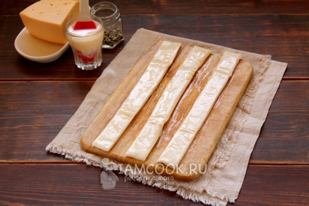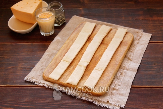 После оттаивания тесто разворачиваем одним пластом, разрезаем полосами шириной порядка 1,5 см.