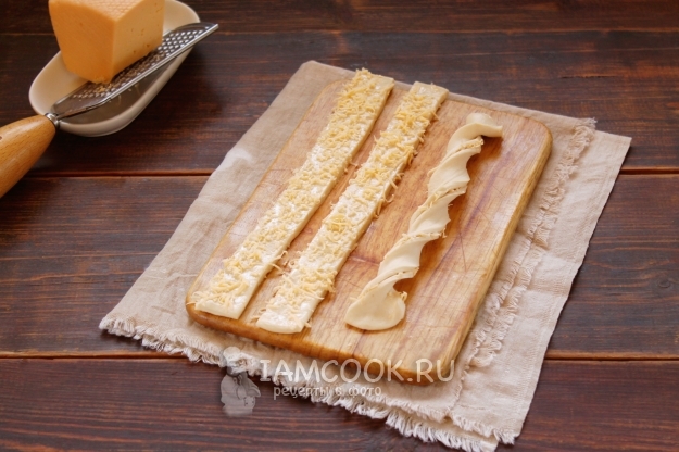 Часть — сырной стружкой. Оставляем палочки ровными или скрученными спиралью.