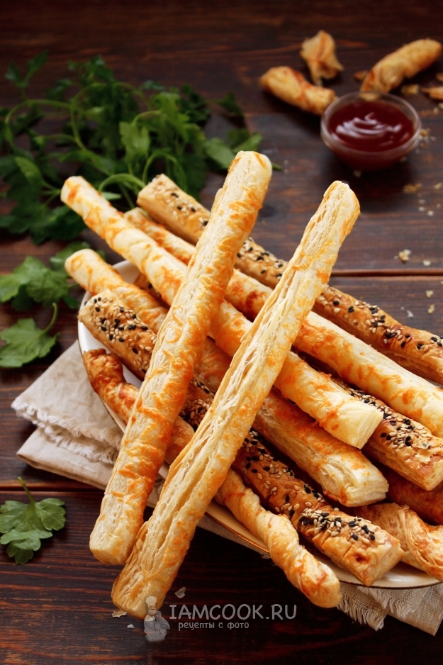 Остудив, подаем хрустящие хлебные палочки из слоеного теста к столу.