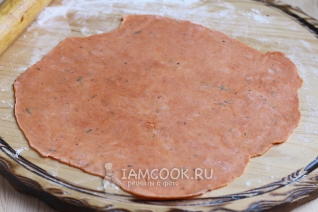 Перед выпечкой разогреем духовку до 190-200 градусов. После достанем тесто, разделим пополам и уберем одну часть обратно в холодильник, а вторую часть раскатаем очень тонко - не более 2 мм.