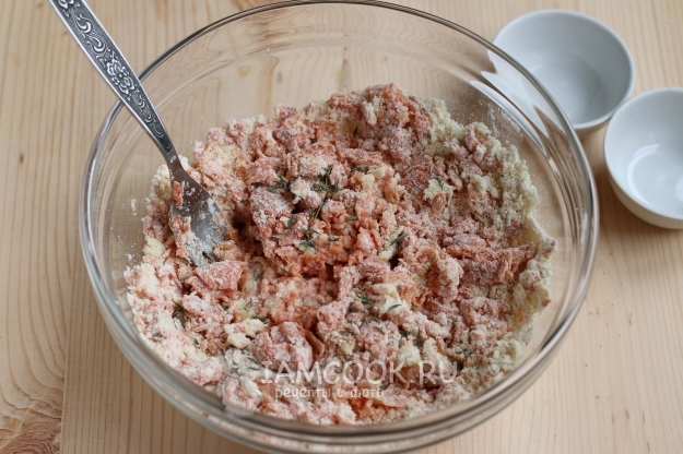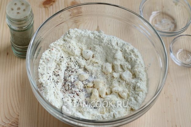 Высыпаем муку в миску и добавляем порезанное кусочками холодное масло, соль и молотый перец. Разомнем все в крошку при помощи обычной вилки.