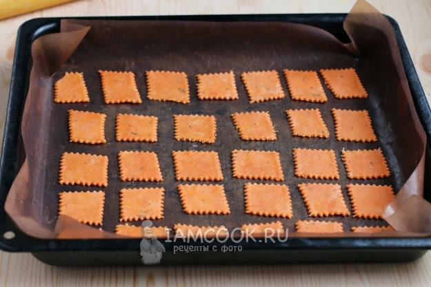 Готовы крекеры будут через 6-7 минут. Первую партию я не накалывала вилкой и крекеры получились пузатенькими. Достаем их и снимаем с коврика.