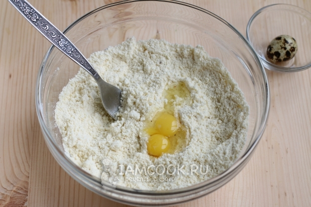 В эту массу добавим два перепелиных яйца и продолжим смешивание. Кстати, можно использовать и одно куриное яйцо, но тогда в тесто добавьте только желток, а белок оставьте для смазки крекеров перед выпечкой.