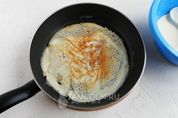 Когда увидели, что блинчик начал подсыхать, аккуратно поддевая края блина лопаткой, переворачиваем его на другую сторону и жарим до готовности.