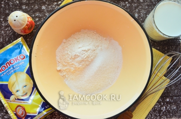 Возьмите глубокую миску, чтобы было удобно замешивать тесто. Смешивать ингредиенты можно в любом порядке. К примеру, начните с муки - пересыпьте указанное количество в миску и добавьте сахар. Бросьте щепотку соли.
