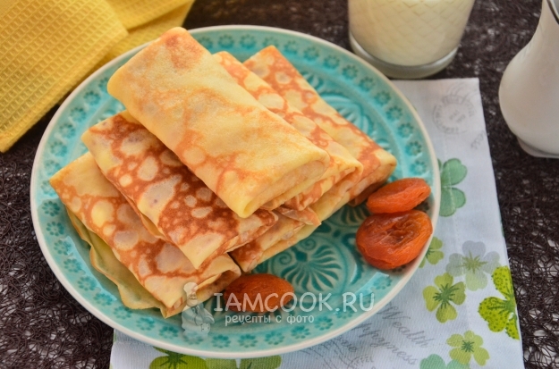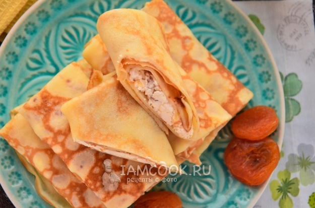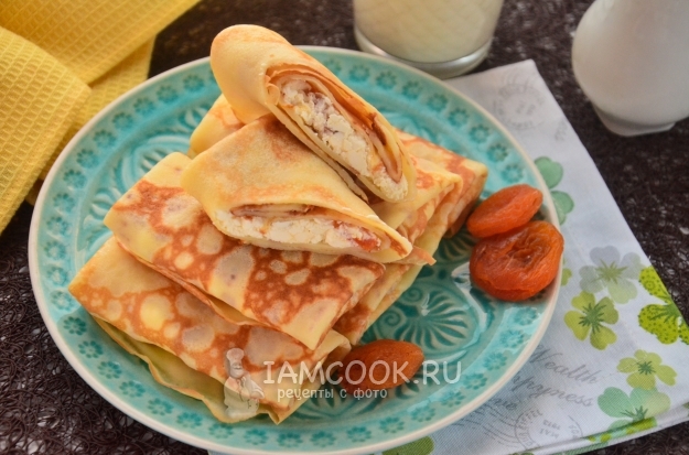 Повторите манипуляции, пока не закончатся блины или начинка. Подавать блины с творогом и курагой можно сразу.