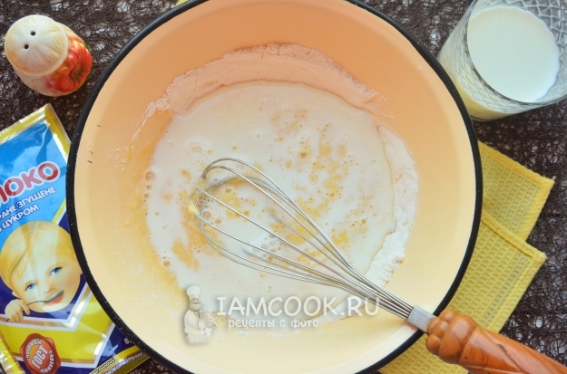 Понемногу начните подливать молоко (любой жирности), не прекращая размешивать венчиком будущее блинное тесто.