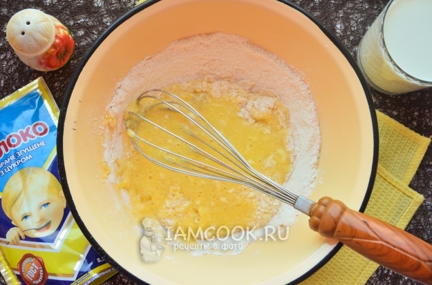 Понемногу начните размешивать яйца с мукой с помощью венчика. Можно использовать ручной девайс или механический.