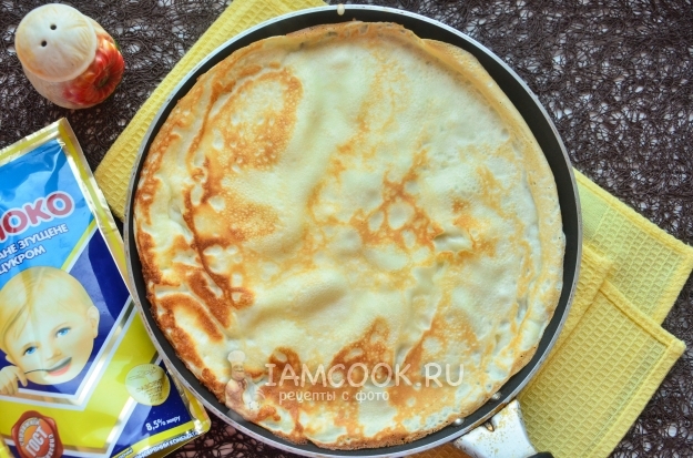 Лопаткой переверните блинчик на другую сторону и жарьте его еще минуту-полторы. После этого снимите со сковороды и жарьте следующий блинчик.