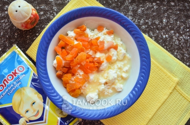 Сделайте начинку - в пиалу пересыпьте творог, добавьте сгущенное молоко. Курагу мелко нарежьте и тоже отправьте в миску. Если она слишком сухая, можно заранее размочить ее, затем обсушить и нарезать.