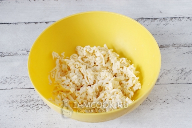 Сырок натираем на крупной терке прямо в глубокую миску, в которой будем делать тесто для сырников. Если вам так неудобно, то натрите сначала на досточку и потом пересыпьте.