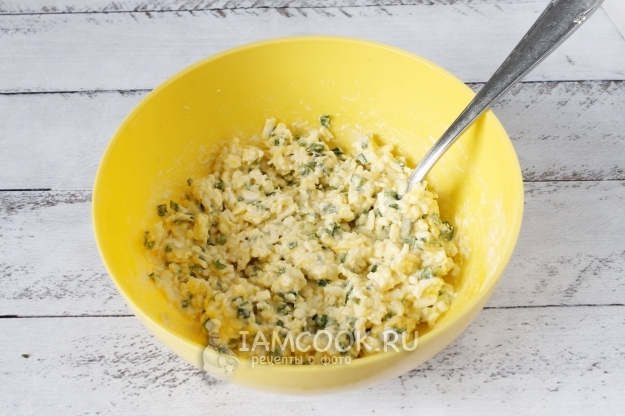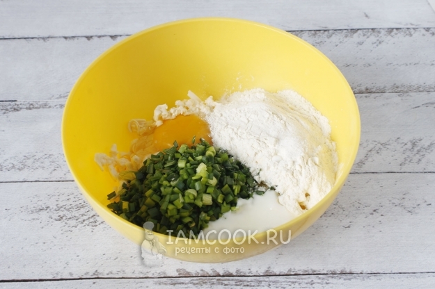 В миску с сыром всыпаем лук, вбиваем яйцо, добавляем соль, муку, разрыхлитель и кефир. Вместо кефира можно взять сметану (15-20%) - 1-2 столовых ложки.