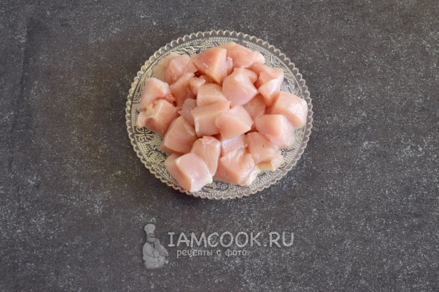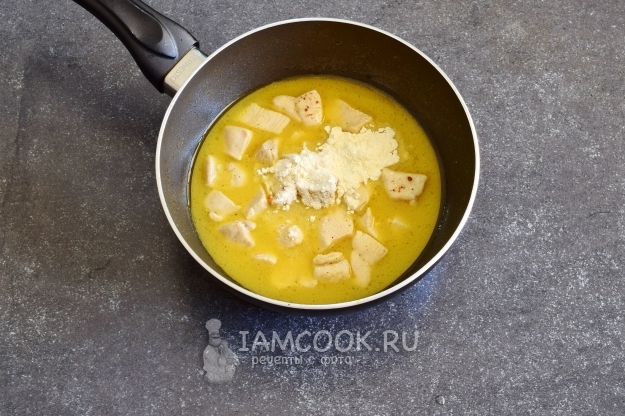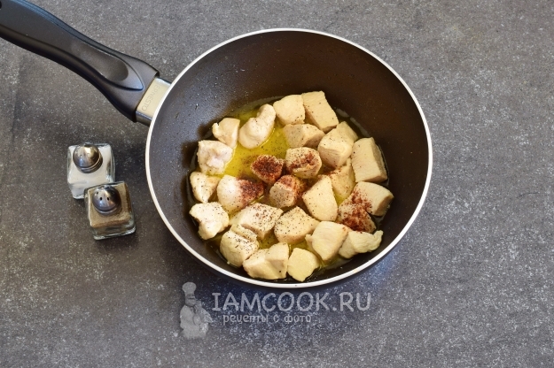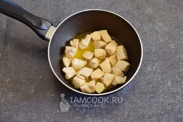 В сковороде растопим сливочное масло и обжарим на нем кусочки куриного мяса минуты 3-5.