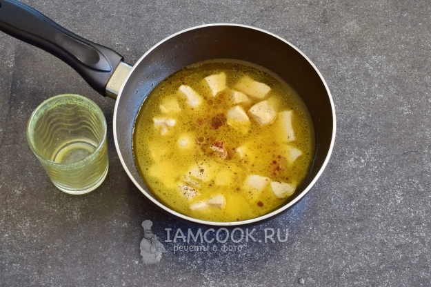 Вольем в сковороду куриный бульон и готовим все вместе минут 10.