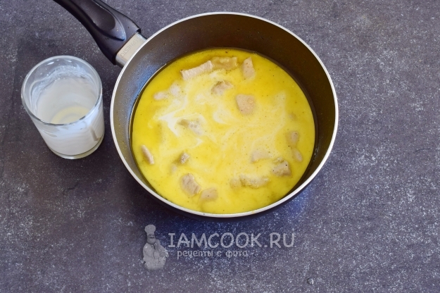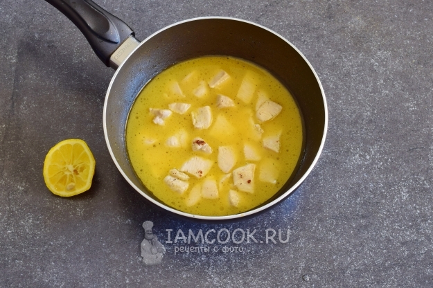 Добавляем взбитый желток в сковороду к фрикасе и готовим еще 3-4 минуты.