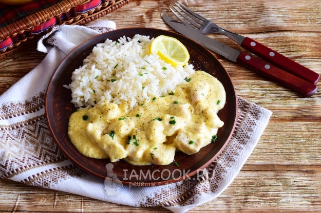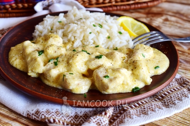 Готовое классическое фрикасе с курицей подаем порционно с отварным рисом.