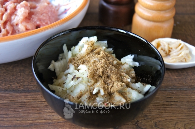 Лук мелко порубим, добавим специи для мяса, соль, перец, рисовый уксус и перемешаем.