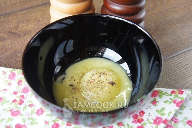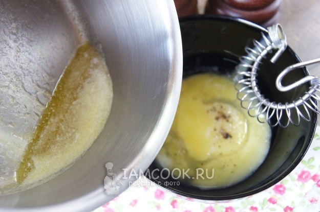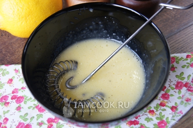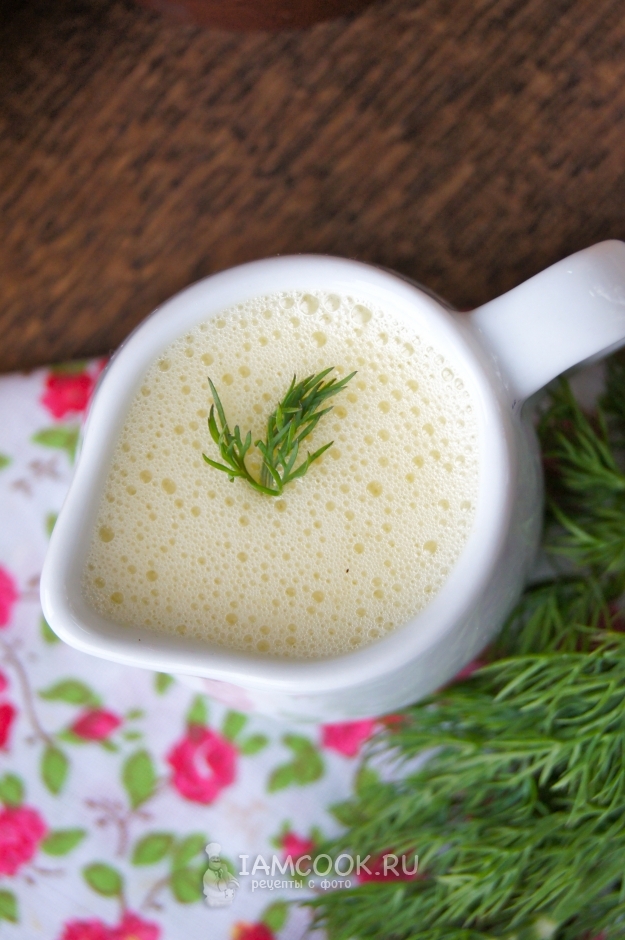 Влейте растопленное сливочное масло и хорошенько взбейте венчиком или блендером в однородную массу, соус должен получиться как жидкая сметана.
