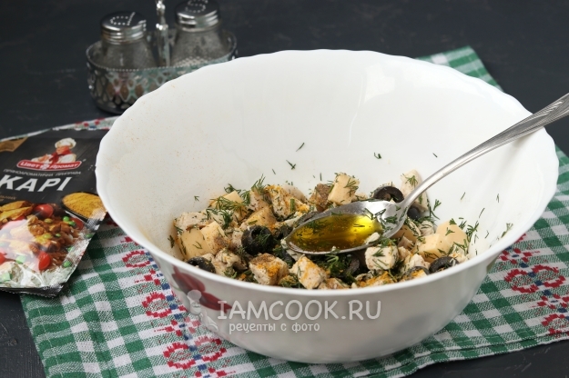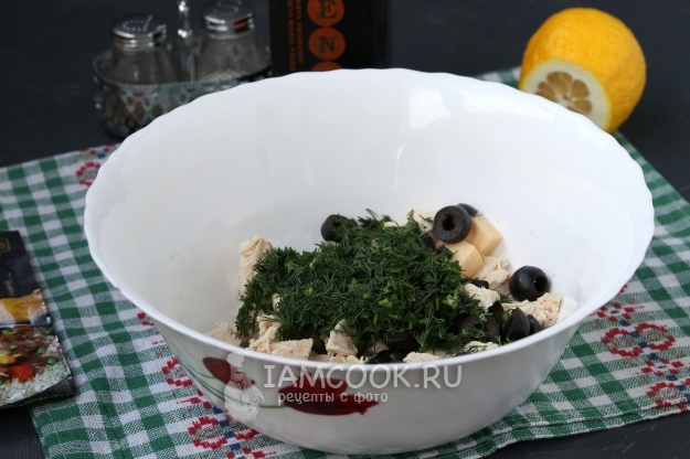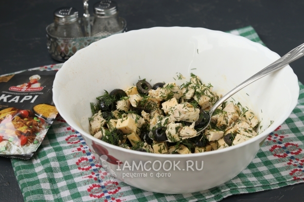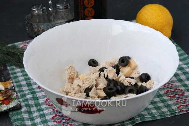 Курицу и сыр сложить в миску, добавить к ним нарезанные кружочками маслины.