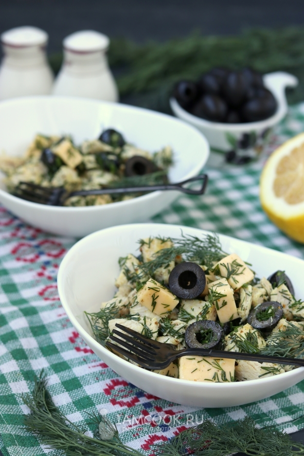 Салат с курицей, маслинами и сыром готов. Разложить его в пиалы и подать к столу.