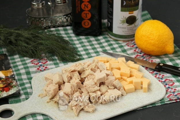 Когда филе будет готово, его нужно остудить и нарезать крупными кубиками, также нарезать твёрдый сыр.