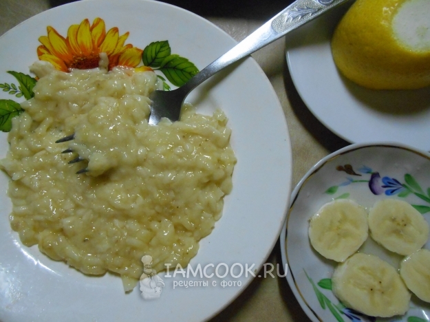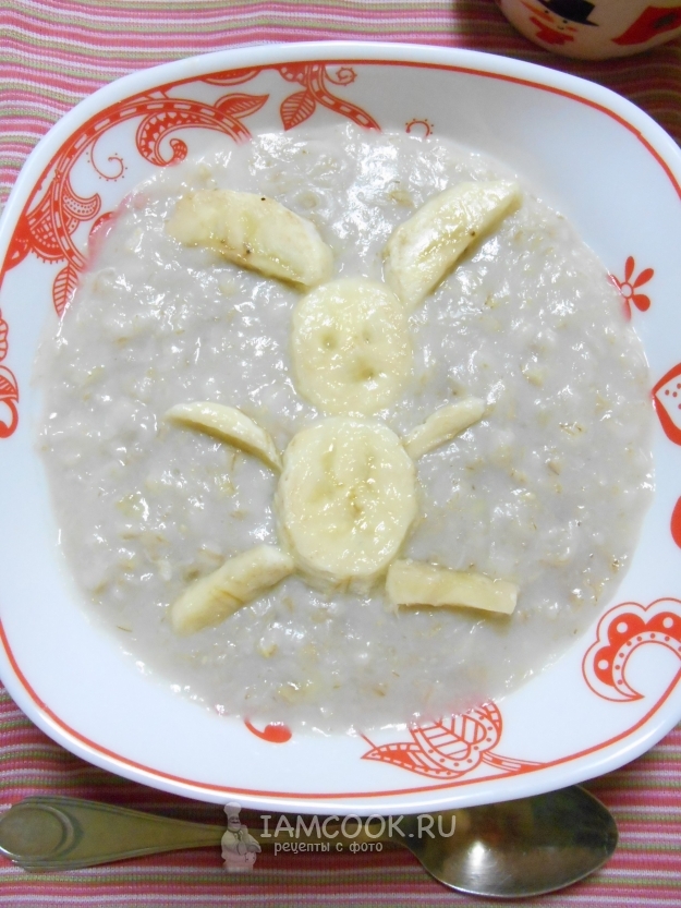 Выложим кашу в тарелку. Промоем кипячёной водой кусочки банана от лимонного сока. Украшаем фигуркой животных или солнышка (то, что малыш узнает). Приятного аппетита!