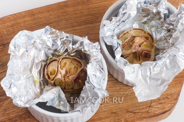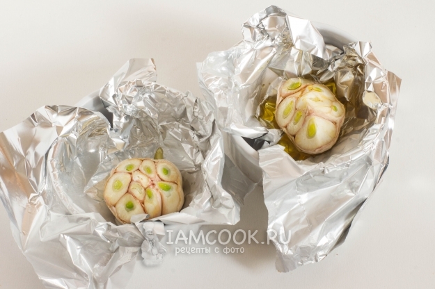 У чеснока удалите верхний слой шелухи, срежьте верхушку. Положите головки в огнеупорную форму (или формы) на слой фольги. Сверху полейте 1 ст.л. растительного масла. Поставьте в духовку, разогретую до 180 градусов, закрыв чеснок краями фольги, на 1-1,5 часа (в зависимости от размера чеснока).