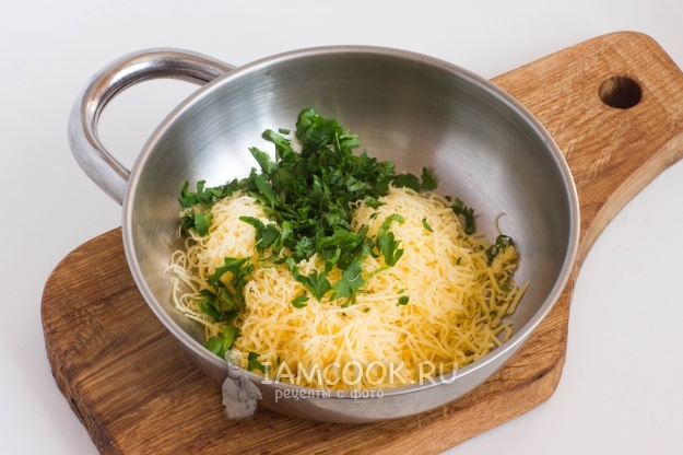 Сыр натрите на мелкой терке, добавьте зелень петрушки, соль по вкусу.