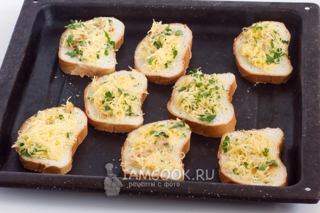 Ломтики батона выложите на противень, сверху равномерным слоем выложите сырную начинку.