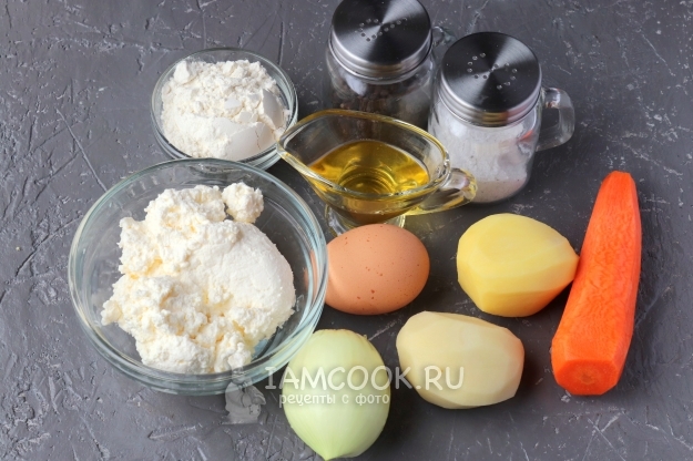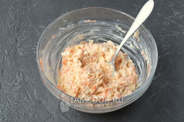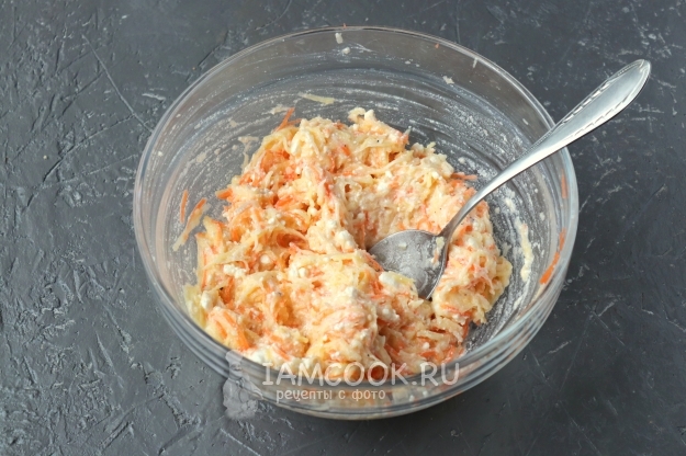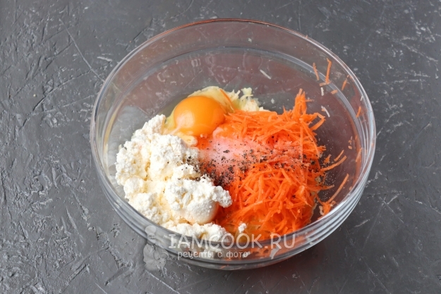 Добавим морковь, измельчённую таким же способом, а также соль, перец, куриное яйцо и творог. Если молочный продукт оказался слишком зернистым - перетрём его через мелкое сито.