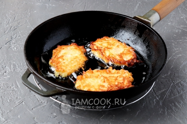 Обжарим драники на среднем огне до золотистого цвета, по 2-3 минуты с каждой стороны. Готовые лепёшки переложим на плоскую тарелку, застеленную бумажными салфетками.