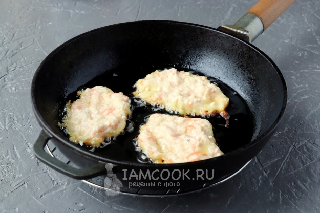 Сковороду с растительным маслом хорошо разогреем, после чего столовой ложкой выложим творожно-овощную массу, формируя небольшие заготовки.